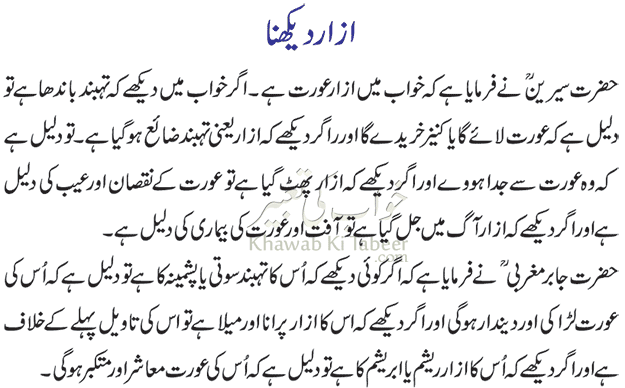 حضرت سیرینؒ نے فرمایا ہے کے خواب میں ازارعوت ہے۔اگر خواب میں دیکھے کہ تہبند با ند ھاہے تو دلیل ہے کہ عورت لائے گایا کنینرخریدے گا اورراگردیکھے کہ ازاریعنی تہبندضائع ہو گیا ہے۔تو دلیل ہے کہ وہ عورت سے جدا ہووے اور اگر دیکھے کہ ازار پھٹ گیا ہے تو عورت کے نقصان اور عیب کی دلیل ہے اوراگر دیکھے کہ ازار آگ میں جل گیا ہے تو آفت اور عورت کی بیماری کی دلیل ہے۔ حضرت جابر مغربیؒ نے فرمایا ہے کہ اگرکوئی دیکھے کہ اُ س کا تہبند سوتی یاپشمینہ کا ہے تودلیل ہے کہ اُس کی عورت لڑاکی اور دیندار ہوگی اور اگر دیکھے کہ اس کا ازار پر انا اور میلاہے تو اس کی تا دلیل پہلے کے خلاف ہے اور اگر دیکھے کہ اُس کا ازار ریشم یا بریشم کا ہے تو دلیل ہے کہ اُس کی عورت معاشر اور متکبر ہوگی۔